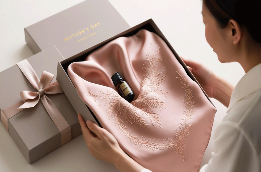お母さんの大切な時間を、もっとリラックスできるものに。エッセンシャルオイルが染み込んだストールは、日常使いできるアイテムでありながら、香りで癒しの空間を提供します。柔らかく温かな肌触りが、まるでお母さんに寄り添っているかのよう。どんなシーンでも使える、シンプルで洗練されたデザインです。