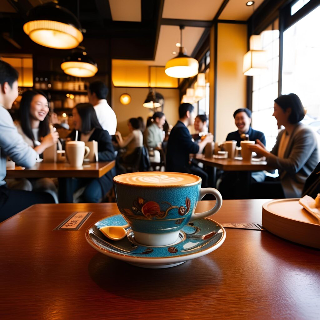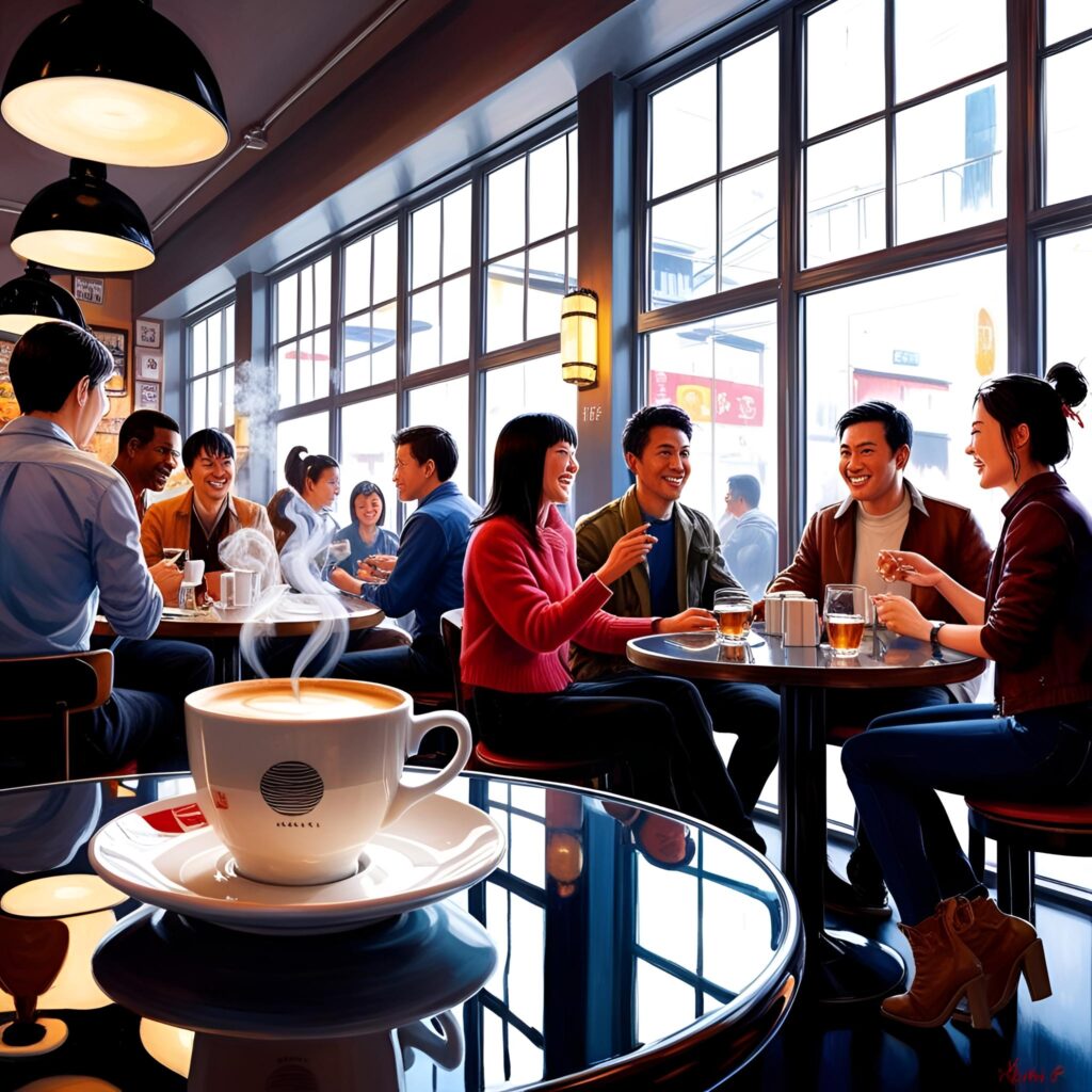 窓際の席では、仲の良い友人同士がカップを傾けながら、楽しそうに笑い合っています。
