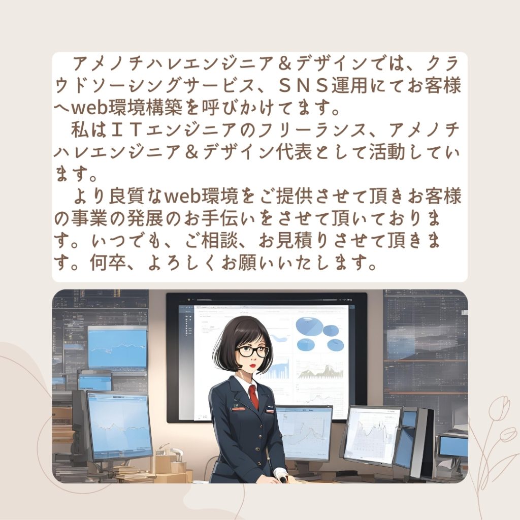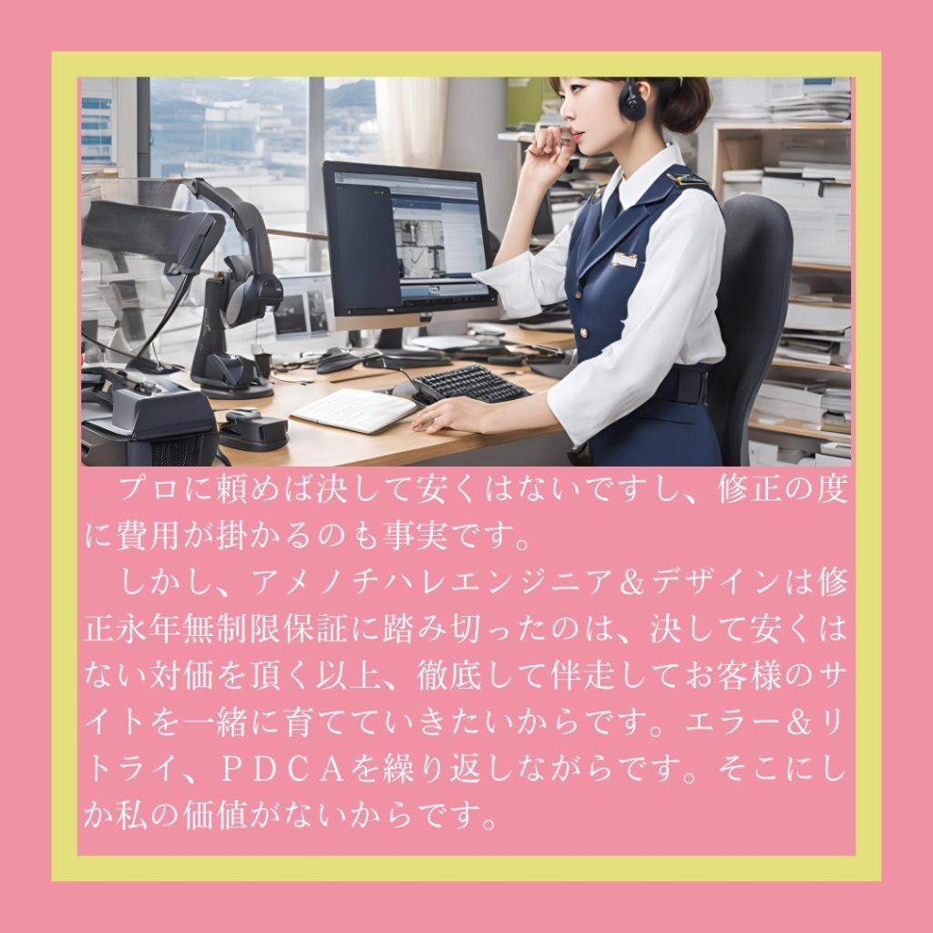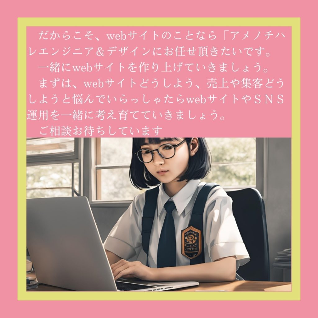 繰り言になりますが、是非とも、web周りの事をどうにかしたいが、誰に頼めばいいかわからないとなったらぜひ、アメノチハレエンジニア&デザインにご用命くださいませ。しっかりお客様の声に耳を傾け、真摯に対応させていただきます。