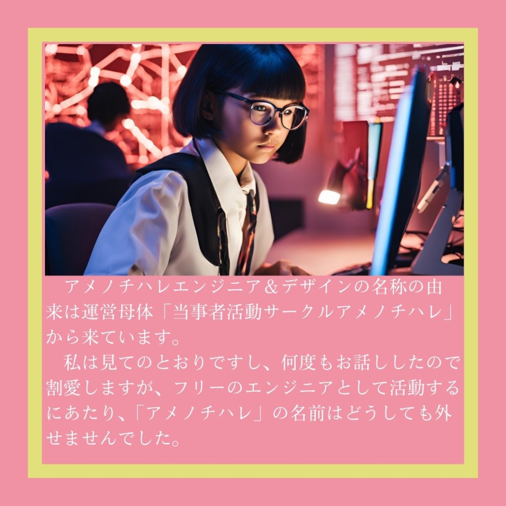 この日の画像を見ると色合いや文章にも統一感や満たすさを意識できるまでになりました。生成AIの画像を使いまわしですが、この日は、「アメノチハレエンジニア&デザイン」のことを知ってもらおうという主旨でご説明がてらのご案内です。