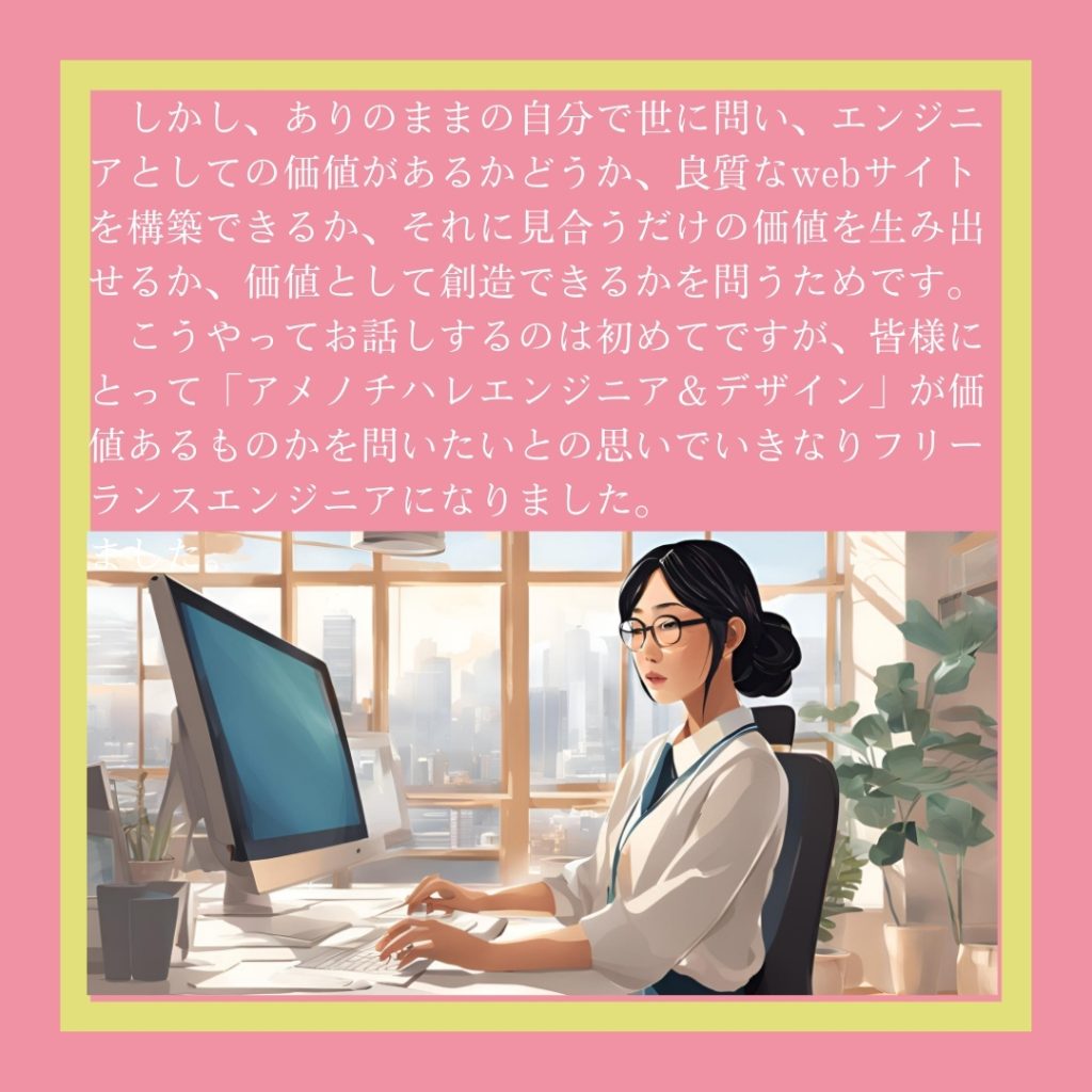 正直言いまして、アメノチハレエンジニア&デザインの事を知らずして、代表である私の事を知らずして「この人に任せようか?」とはならないと思い書き記してみました。