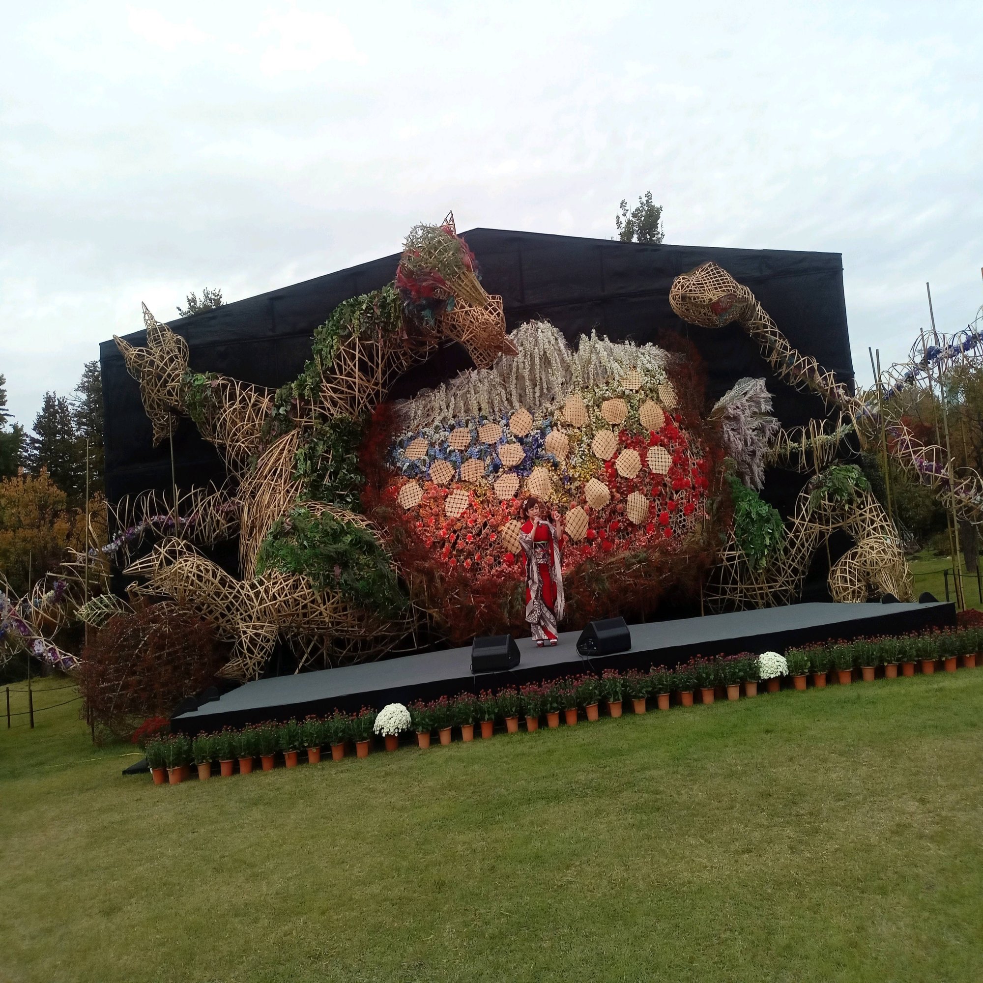 開幕日初日の午後に行ったのですが、メイン会場のフラワーアートを観ようと思ったら、ちょうど弘前市出身の演歌歌手、美咲綾花さんのステージが行われていました。いつもなら素通りするのですが、なぜか、吸い寄せられるようにベンチに座ってました(笑)しかもステージから見てど真ん中の一番前でした。