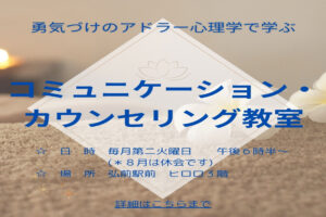 対面でのカウンセリング・コーチングの講座の受講者募集の広告になります。講師の先生のお考えでシンプルかつ日時・場所を記載しております。